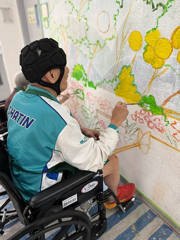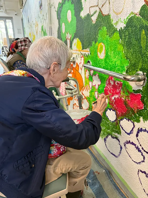 活動當日,一眾老友記化身藝術家,與義工們齊心協力,將天馬行空的想像力揮灑在牆壁上。原本素白的牆面,漸漸變成了一幅生機勃勃的藝術品。