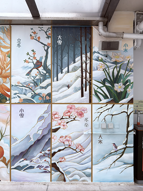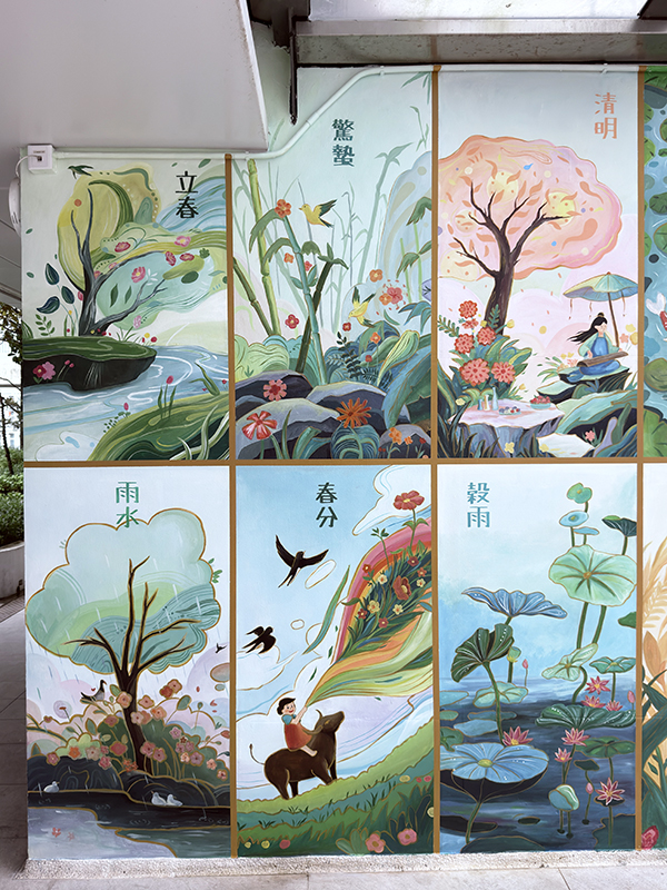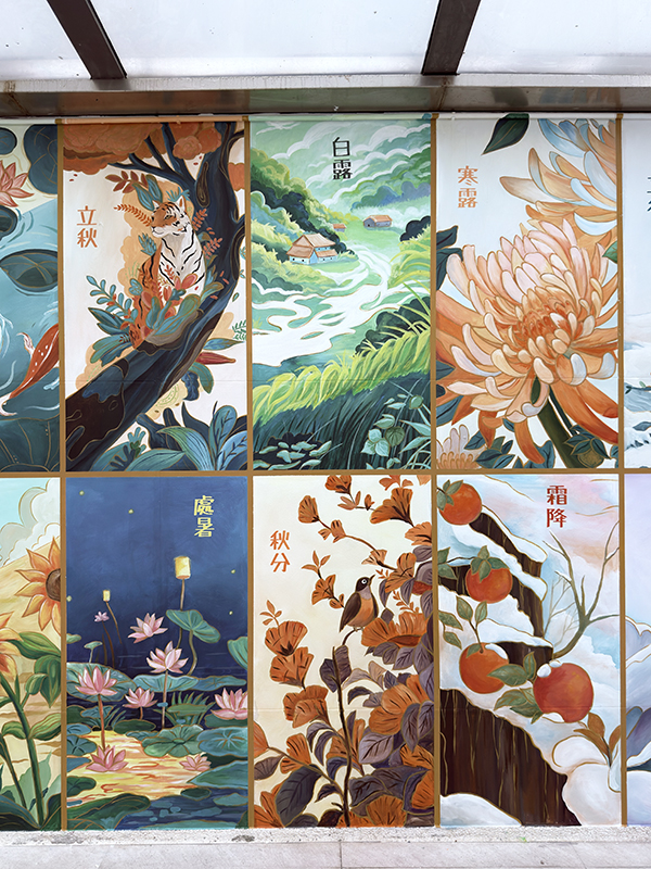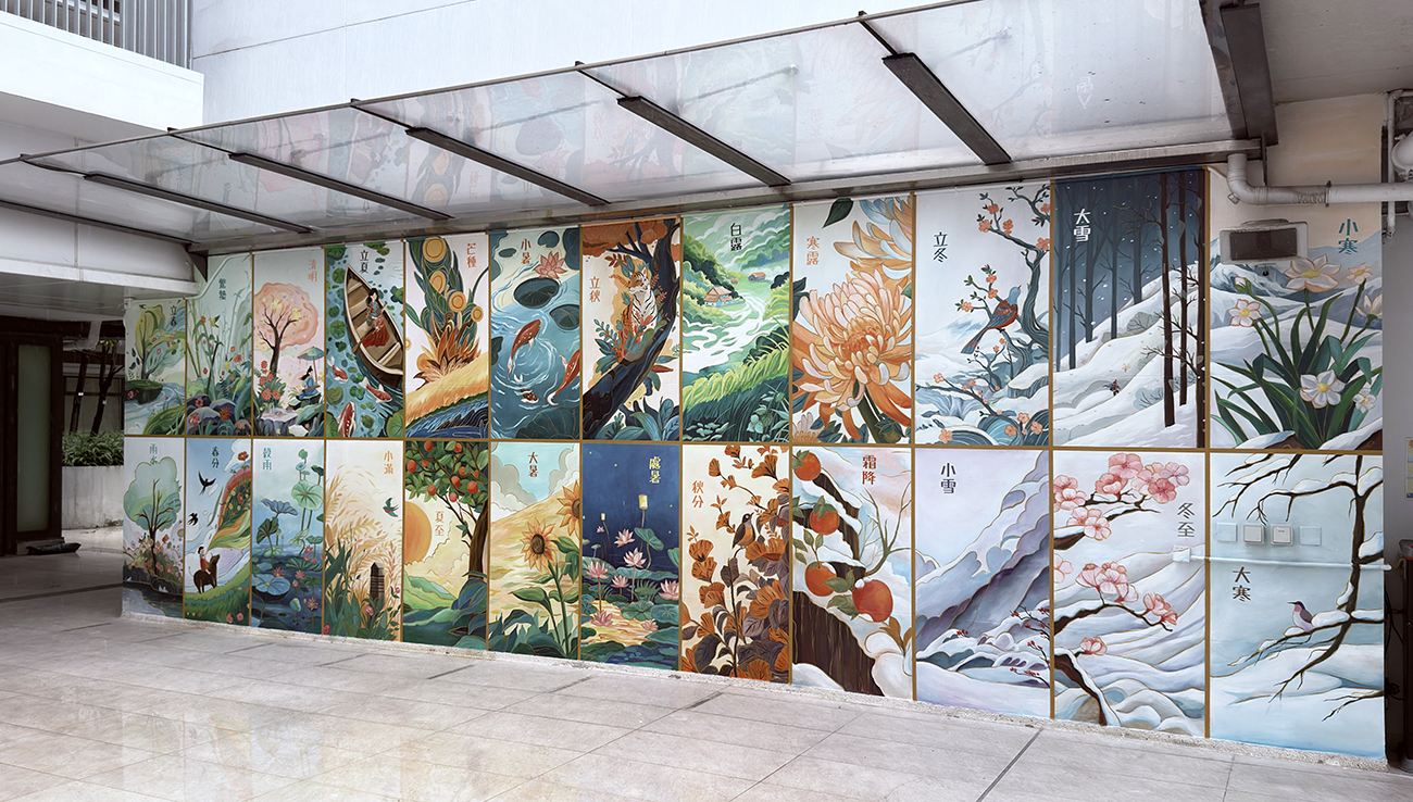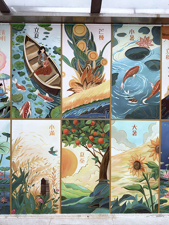 每一個節氣都是一幅獨特的畫面,共同串聯起四季的循環與生命的韻律。我們運用鮮明和諧的色彩,讓整幅壁畫充滿了活力與美感,吸引師生們駐足欣賞,探索其中蘊藏的細節與故事。